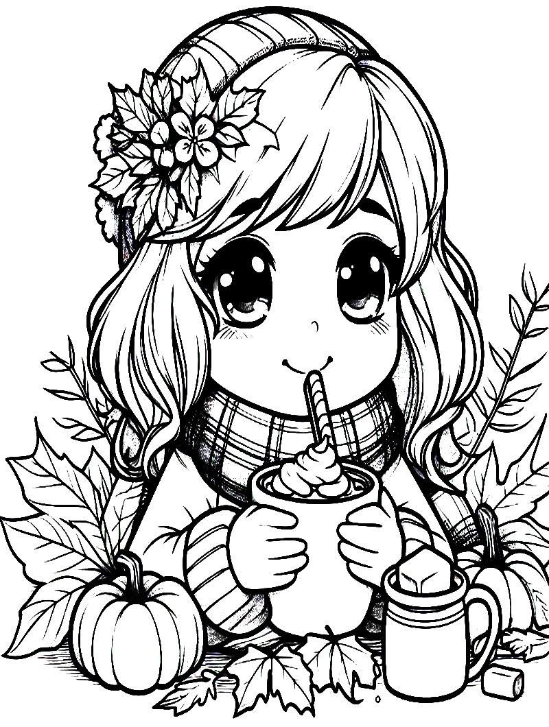 Autumn Coloring Pages: A warm mug of hot chocolate sits in the hands of a small girl sitting on the porch steps. She blows gently on the steaming drink, before taking a careful sip and the rich cocoa warms her all up inside.