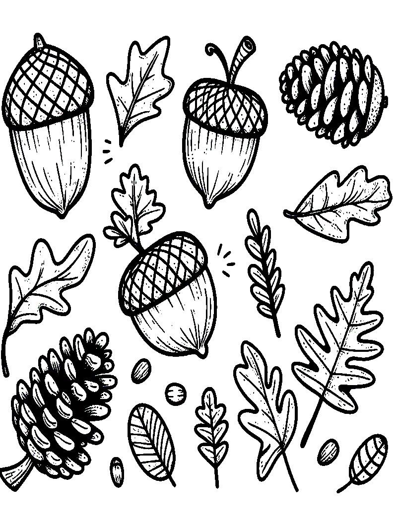 Autumn Coloring Pages: Various acorns and pinecones lie throughout the forest as natural autumn decorations. The squirrel stores acorns for winter survival and the pinecone seeds will expand into majestic trees.