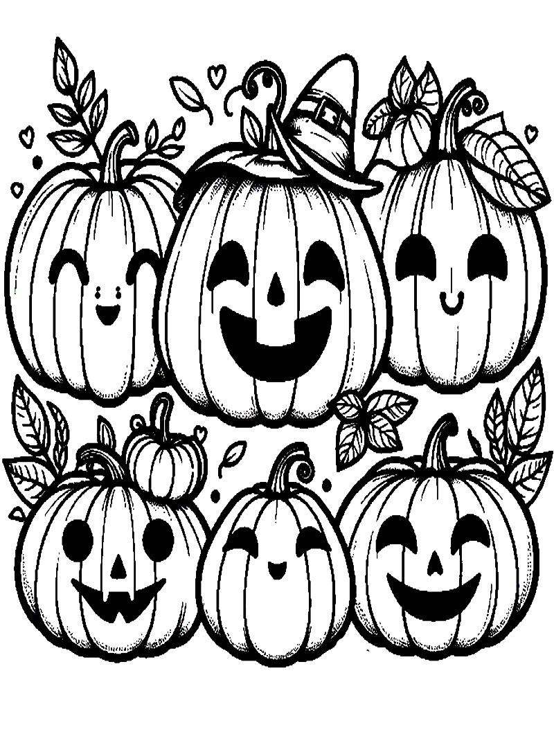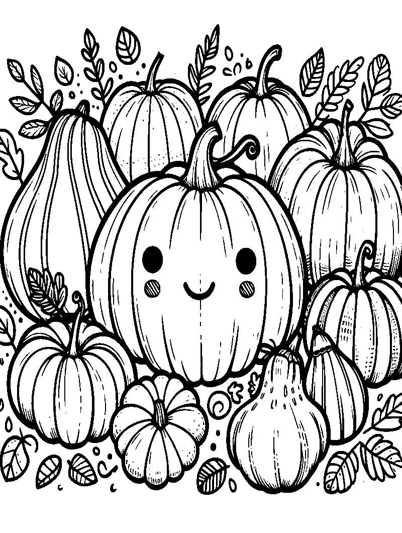 Autumn Coloring Pages: That sounds adorable! Several pumpkins display basic happy expressions through their faces with traditional triangular eyes among the ones who show wide smiles and additional friendly options featuring their round eyes and small grins.