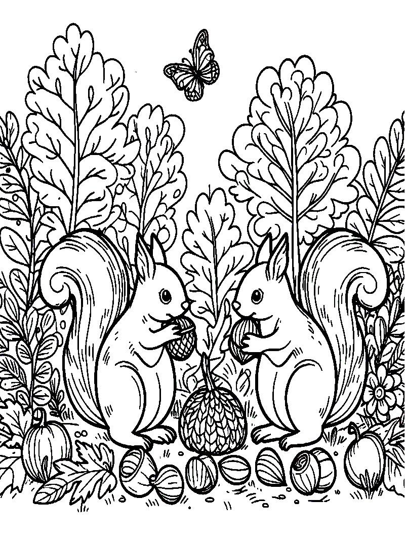 Autumn Coloring Pages: In autumn squirrels carry out extensive nut collection to have food stocked for winter. The creatures move swiftly between parks and forests where they pick up nuts before placing them in secret spots for the coming winter season. These intelligent animals use their bushy tails along with quick-moving tiny paws to secure food stores which will help them survive during treeless winter months with snow-capped ground.