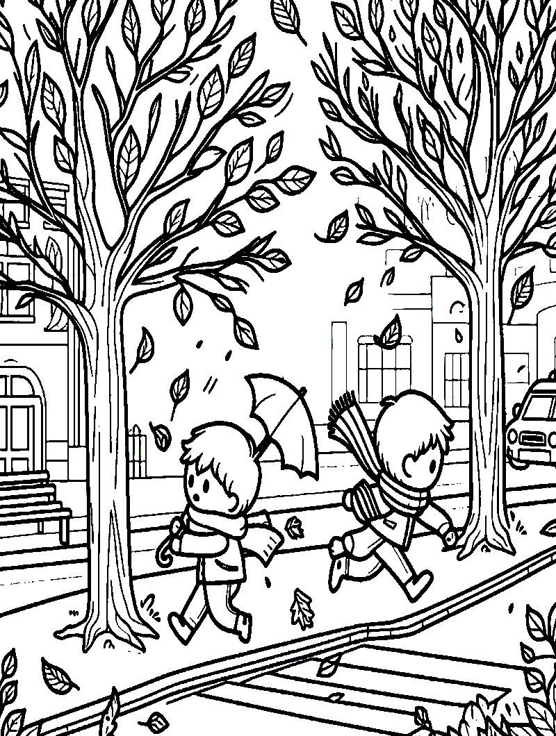 Autumn Coloring Pages: The brisk autumn wind causes trees to shed their leaves which create a vibrant carpet to cover street surfaces. Leaves circle the air like a dance storm as the wind gusts through the streets where pedestrians rush by with their coats and scarves protecting them from the cold temperatures. The gusts encourage some individuals to dash between trees yet several people pause to admire the seasonal transformation as their footsteps create sounds on the leaf-display.