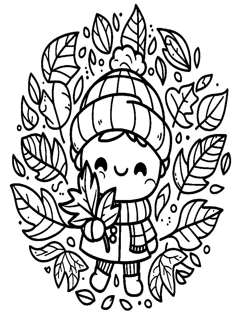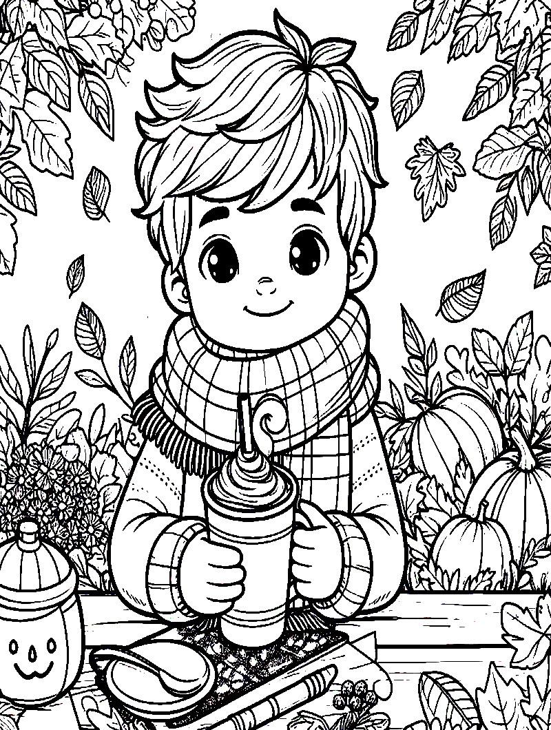 Autumn Coloring Pages: He is a young boy sitting on a wooden bench holding a steaming mug of hot chocolate in his hands. The crisp autumn air smells of cocoa, and he carefully sips on it, his warmth spreading through him. His feet are swirled with golden leaves that rustle as they dance in the breeze. The world slows down for him with rosy cheeks and a contented smile until everything is cozy around him with the smell of the season.