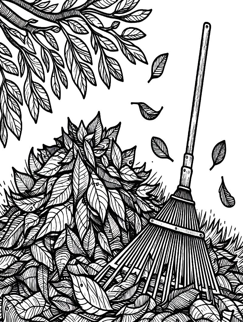 Autumn Coloring Pages: The cooling autumn air blows through the branches making the remaining autumn leaves fall from their branches. The old oak tree hosts a wooden rake leaning against its trunk while next to it rests a well-ordered collection of red and yellow and orange leaves. A fall aroma permeates the air while the leaf stack appears too symmetrical to resist jumping
