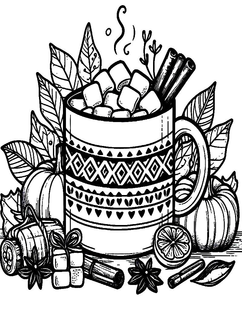 Autumn Coloring Pages: Drinking hot cocoa with marshmallows brings comfort during autumn days characterized by cool temperatures. A steaming hot chocolate drink sits in the cold air as soft marshmallows slowly dissolve on its surface providing rich and creamy sweetness. Drinking the warm beverage beneath a blanket brings comfort and delight to the season.