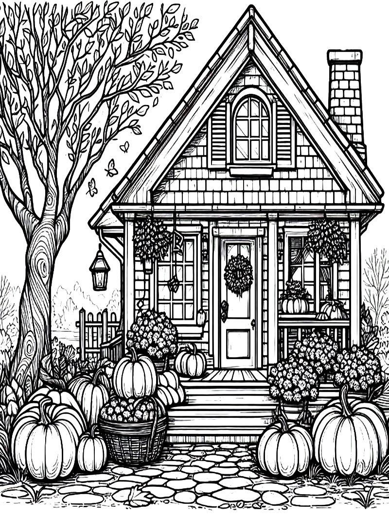 Autumn Coloring Pages: Located in the fall woods stands a lovely home with its entrance decorated by orange gourds and a comfy chair resting on the front porch. A high maple tree stands in the area while its golden leaves move with the light autumn breeze causing leaves to rest upon wooden porch steps. Outside the warm building illumination welcomes guests to step inside after the autumn breeze. The combination of leaf aromas and spiced cider perfumes the air at this scene as if it were an ideal fall getaway.