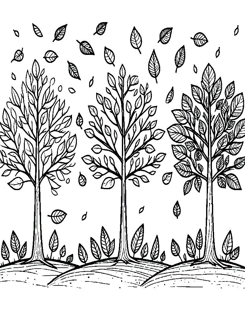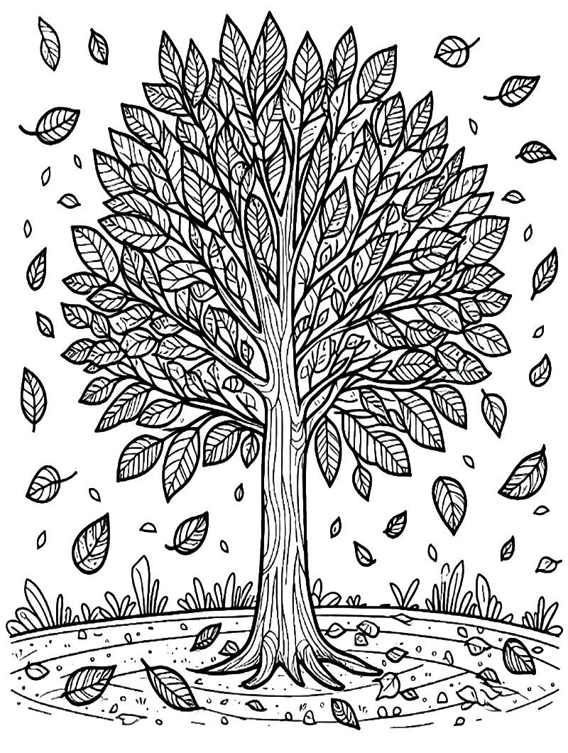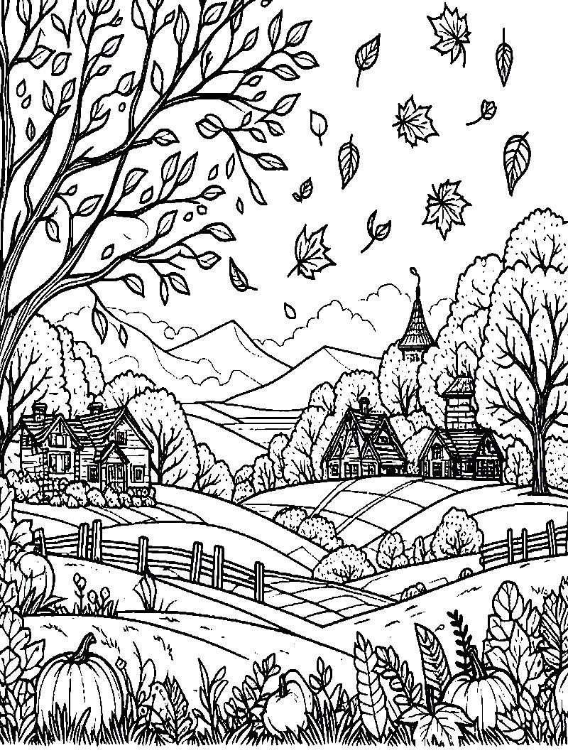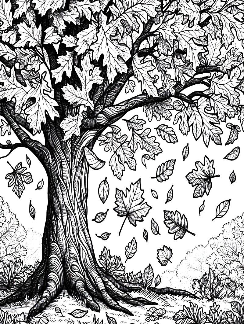 Autumn Coloring Pages: A peaceful autumn landscape appears before us showing big golden maple and deep red oak leaves descending from a tall tree in front of the gleaming sunlight during this crisp fall air moment.