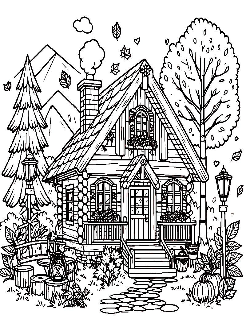 Autumn Coloring Pages: During autumn a chalet creates a beautiful refuge where colorful seasonal elements surround it. The wooden frame of the chalet stands out through its cozy windows that cast warm light into the night from its wooden frames as a blanket of autumn leaves surrounds it. The surrounding view consists of towering red, gold, and orange trees which lead to a home where you can unwind next to the fireplace. Autumn allows you to experience the autumn beauty and natural tranquility within this perfect destination.