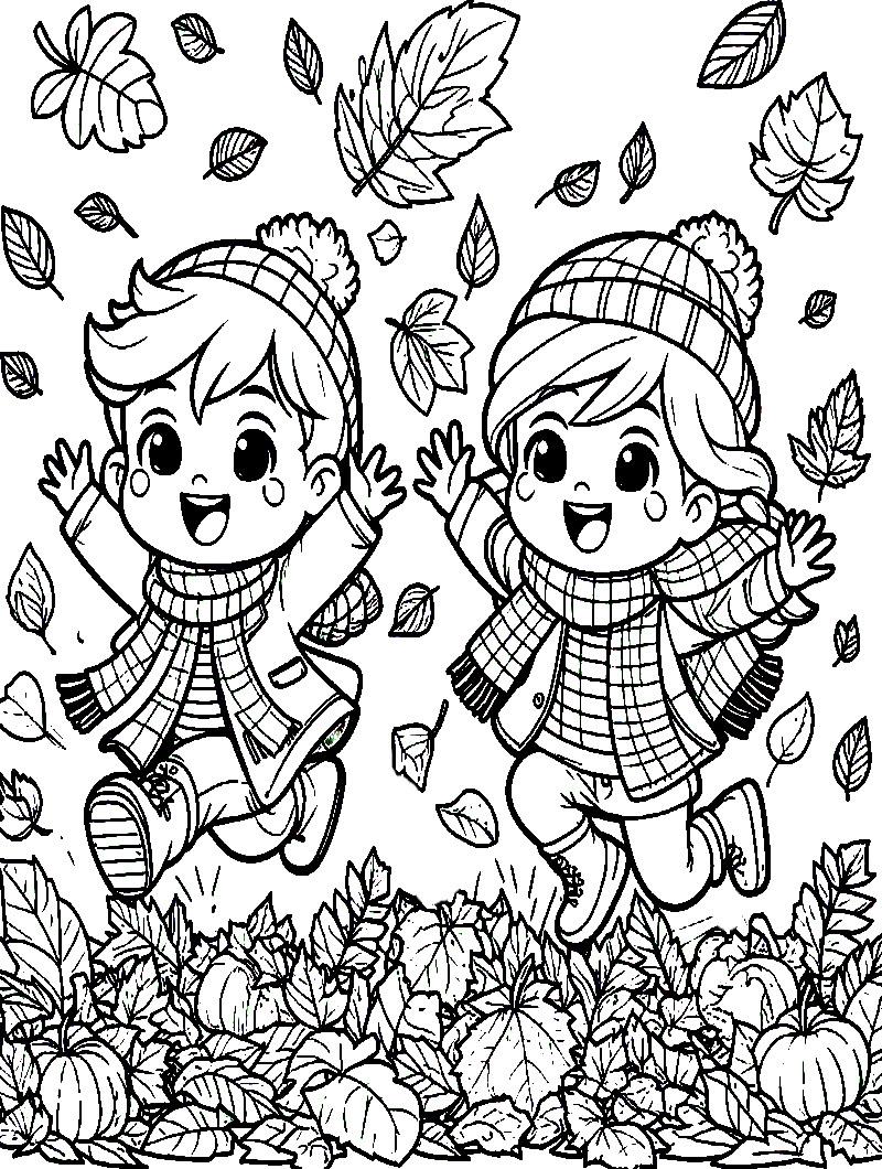 Autumn Coloring Pages: Children happily burrow into different colored leaf piles before they create uproarious sounds with their joyful laughs. While reaching out they plunge into the vibrant leaf piles that display reds, yellows and oranges causing the leaves to scatter through the air. Children take advantage of the autumn atmosphere through various activities as they jump into orange-yellow-leaved heaps while tumbling endlessly while burying themselves in the leaf stacks to enjoy both the seasonal entertainment and the natural autumn beauty.