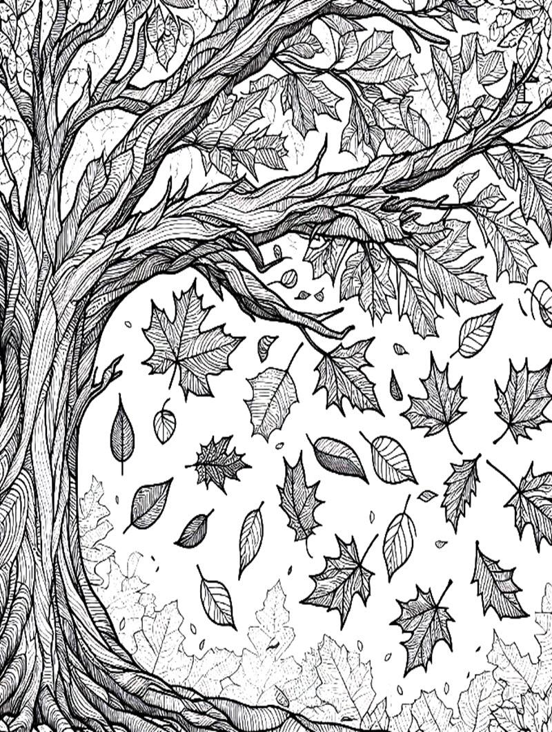 Autumn Coloring Pages: Blueshaded maple leaves and reddish oak leaves create a graceful flight path through the fresh morning air as they loosen from their autumnal perches. The maple leaves perform graceful circular movements until the afternoon sun illuminates them before they gently alight on the ground with a delicate rustling sound. Several leaves rise into the air from the pile because the breeze does not want them to leave the sky.