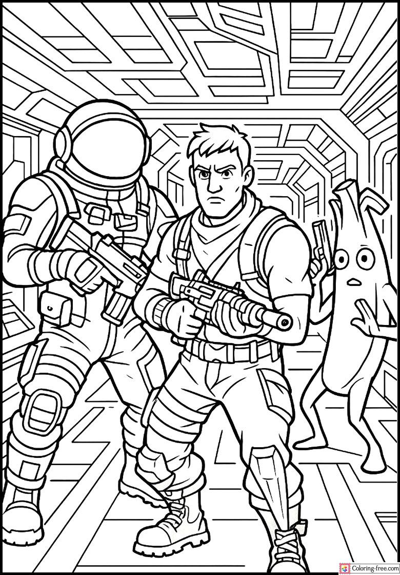 Futuristic space base; Dark Voyager Jonesy and Peely fighting Epic Fortnite coloring page! It is amusing to paint bold outlines and sci-fi features.