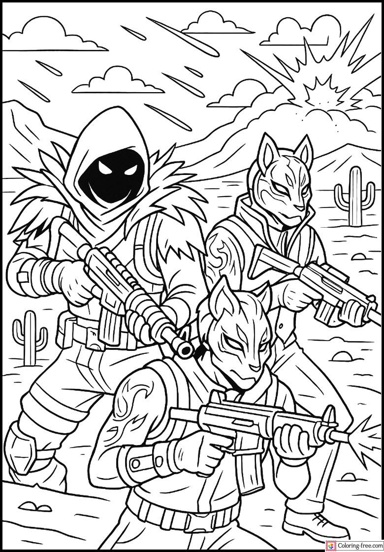 Fortnite color page of Raven, Drift, and Midas firing an empty desert battlefield! Outlines and explosive details tend to be bold, thus it is adventurous to print and color.