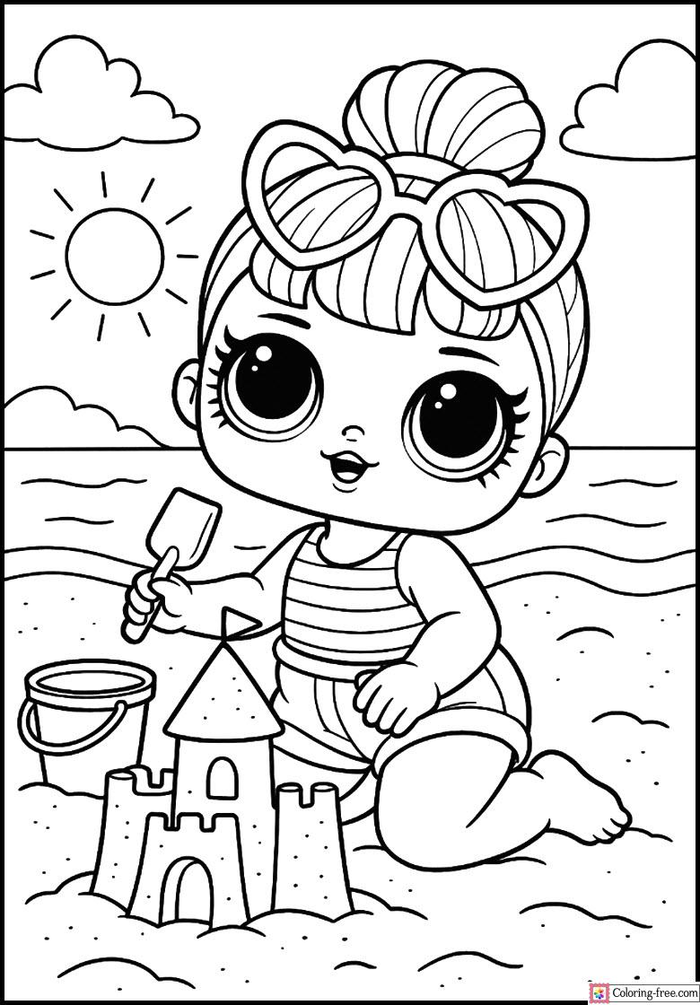Surprisingly cute LOL Surprise Sandcastle construction at the beach! Children who adores summer, sand and can imagine adventures on A4 coloring page in pencils, black marker, markers... show all