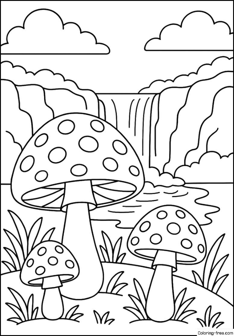 Mushrooms having a good frolic by a pleasant waterfall- a restful and pleasant, elaborate colouring-page of all ages. Ideal of creativity, relaxation, and creativity.