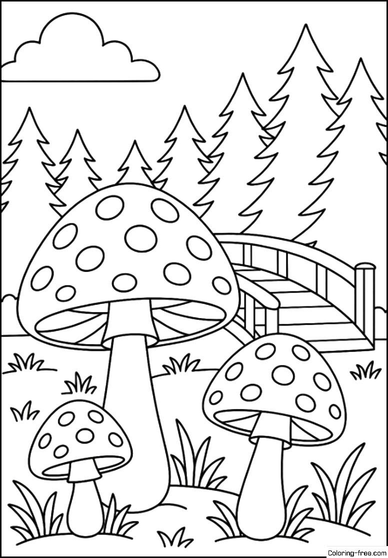 Fungi in the forest with a rural bridge in the background — a calming and detailed colouring image that is ideal to use in mindfulness, nature, and creative processes.
