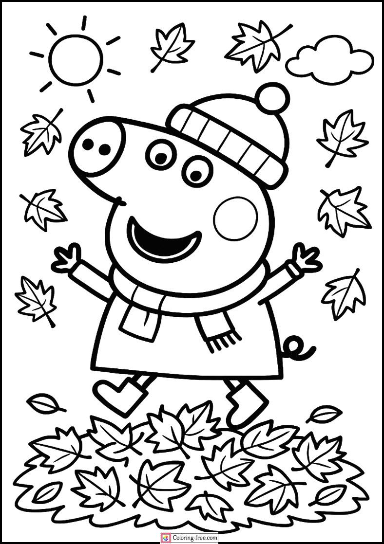This Peppa Pig Jumping in Autumn Leaves coloring page celebrates the beauty and fun of the fall season. Designed in vertical A4 form in bold and simple outlines, it depicts Peppa... show all