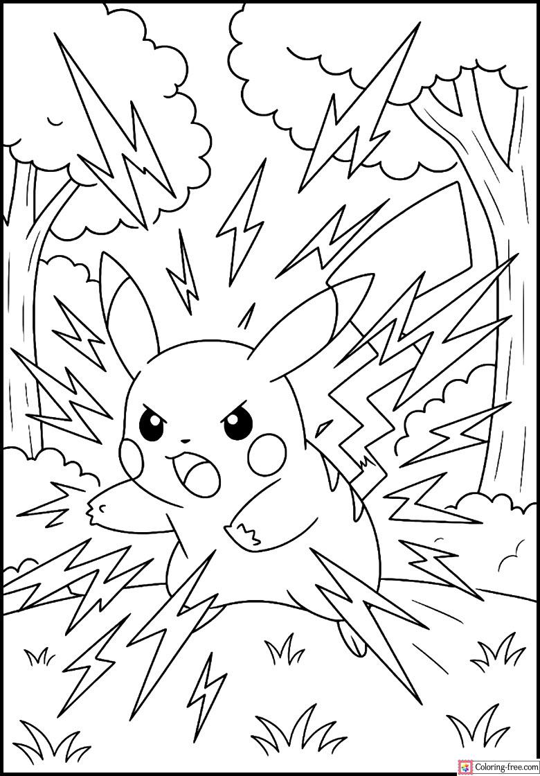 Pikachu charging thunderstorm in coloring page about Thunderbolt- bright outlines, electricity and is a great place to be colored by kids and Pokemon enthusiasts!