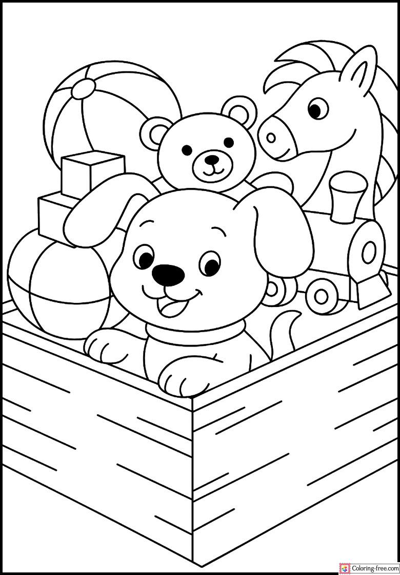 Puppy in a toy box paradise! A cute dog is set in the environment full of stuffed animals, balls, and toys. All free, printable cute chaos coloring page.