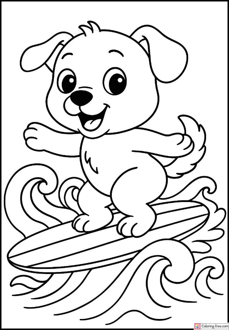 Hang ten, puppy! Colour this cute poster of a cute dog riding a surf board on little waves of sunshine. Beach fun for everyone!