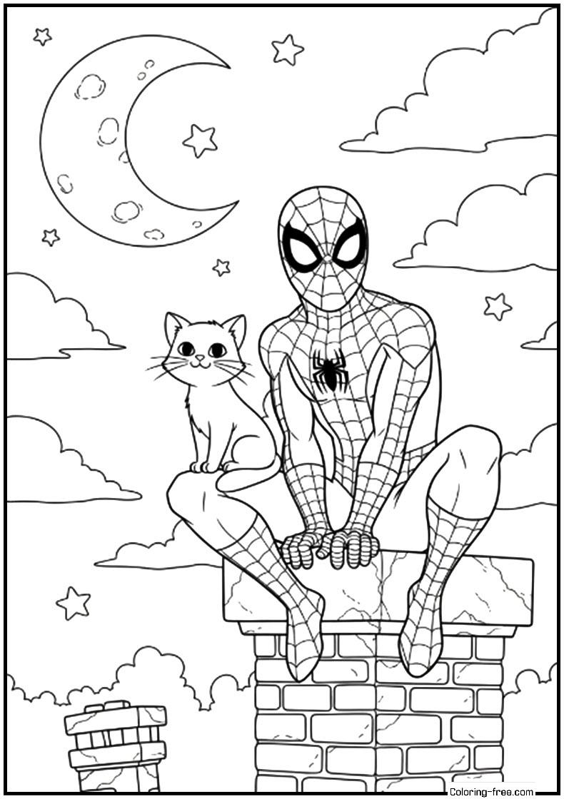Friendly cartoon Cute Spider-Man is placed on a chimney with a charming cat and a stars-filled moonlit sky, a lovely colouring page to keep on the refrigerator.