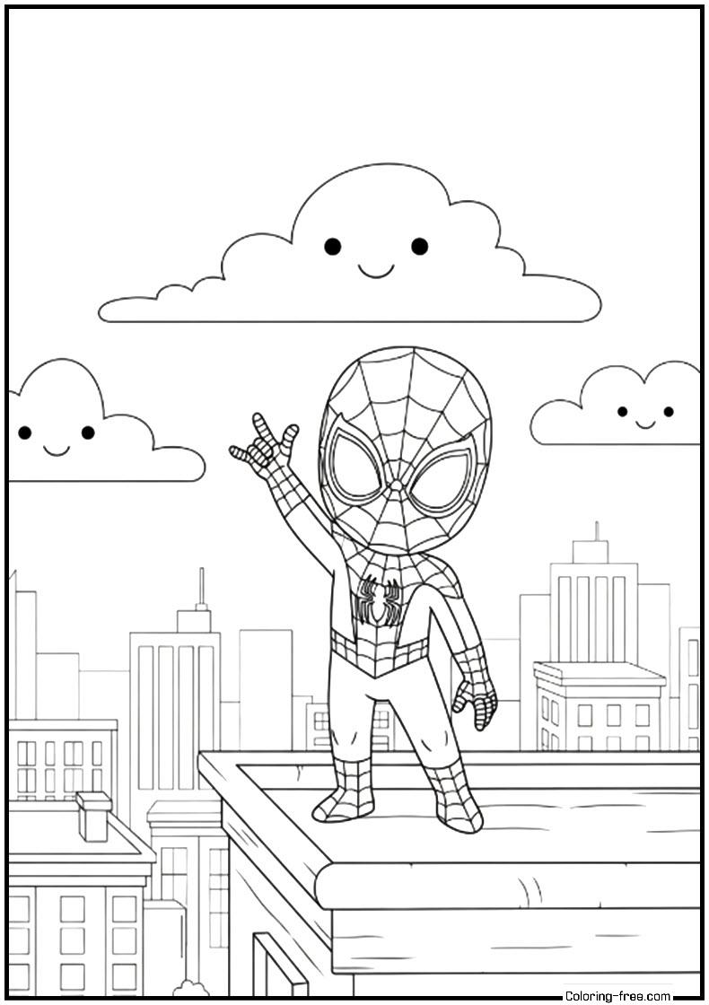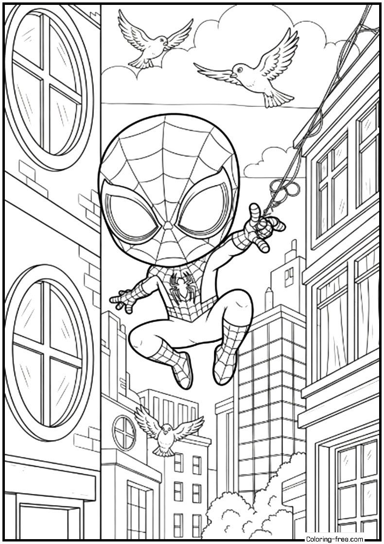 Chibi Spider-Man is a full-colour, playful black and white line art of chasing round windowed buildings, with flying birds surrounding.