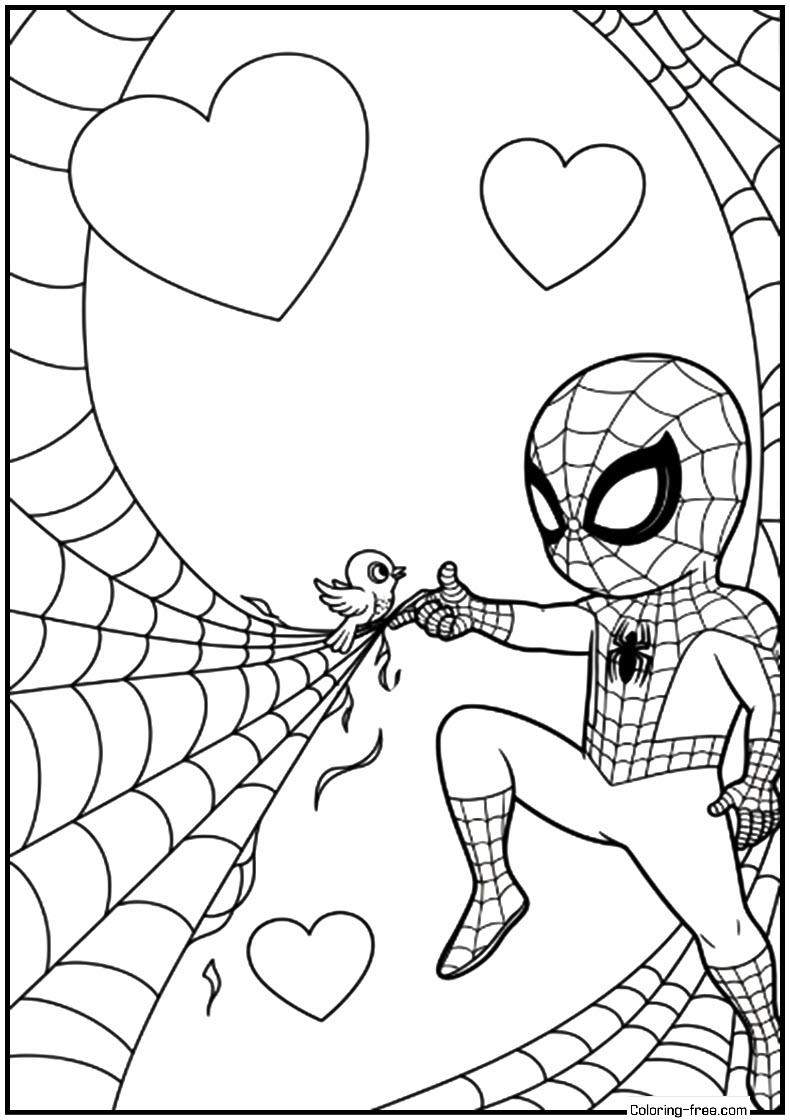 Cute Spider-Man frees a tiny bird trapped in a web, and in the background, you can find heart figures, which make up a cute and child-friendly colouring picture.