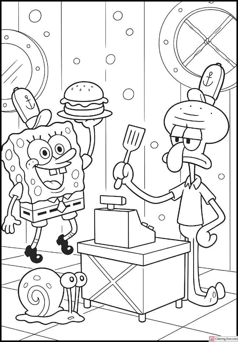 SpongeBob, Squidward on work at the Krusty Krab coloring page. The cartoon and drawing habit with children and Bikini Bottom enthusiasts.