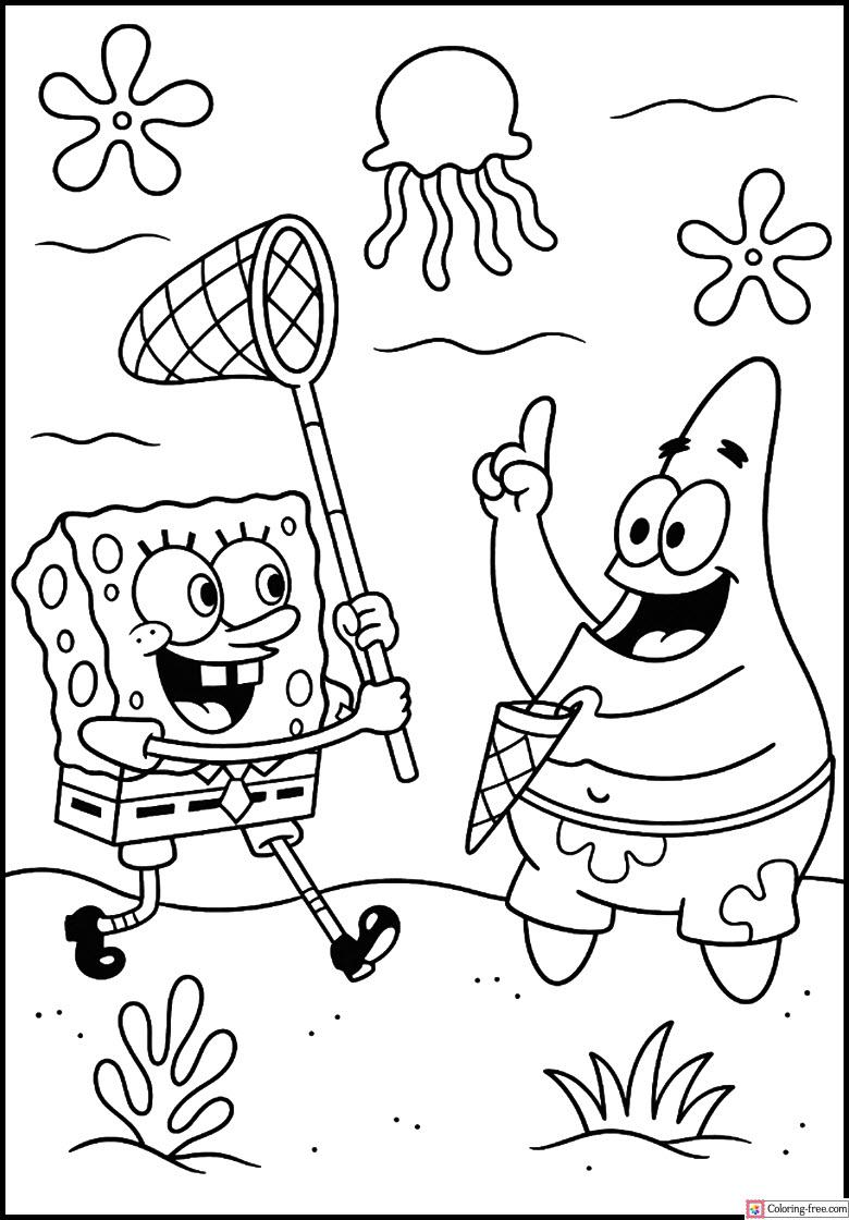 Patrick and spongebob fishing jellyfish page. An entertaining and bright adventurous underwater activity among kids and fans of SpongeBob.