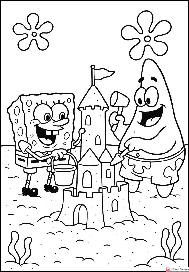 SpongeBob and Patrick construction of a sandcastle with coloring. An amusing and fun-filled scene on the beach to children and fan pages.