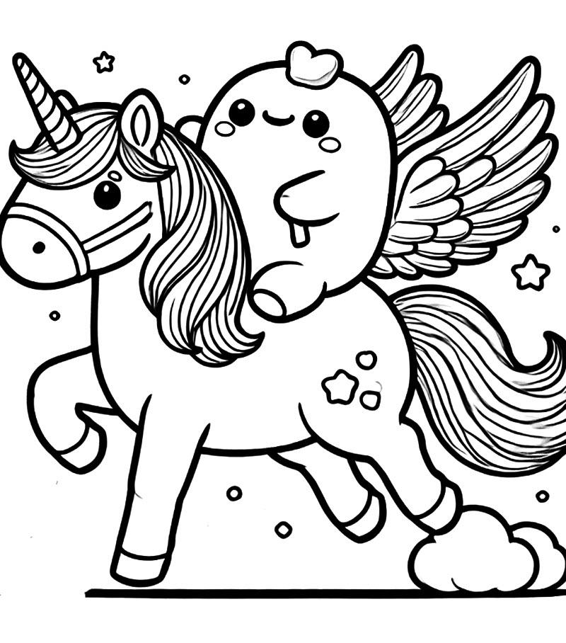 Myra the Pegasus Squishmallow flying high in the mountains and clouds. A dreaming, magical coloring page for kids and fans.