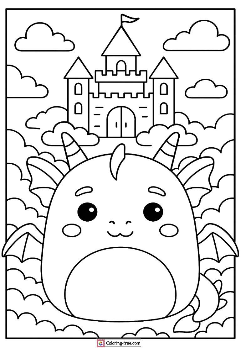 Zoe the Dragon Squishmallow flying around a magical sky castle with towers and clouds. A bold and fantasy-filled coloring page for the fans.