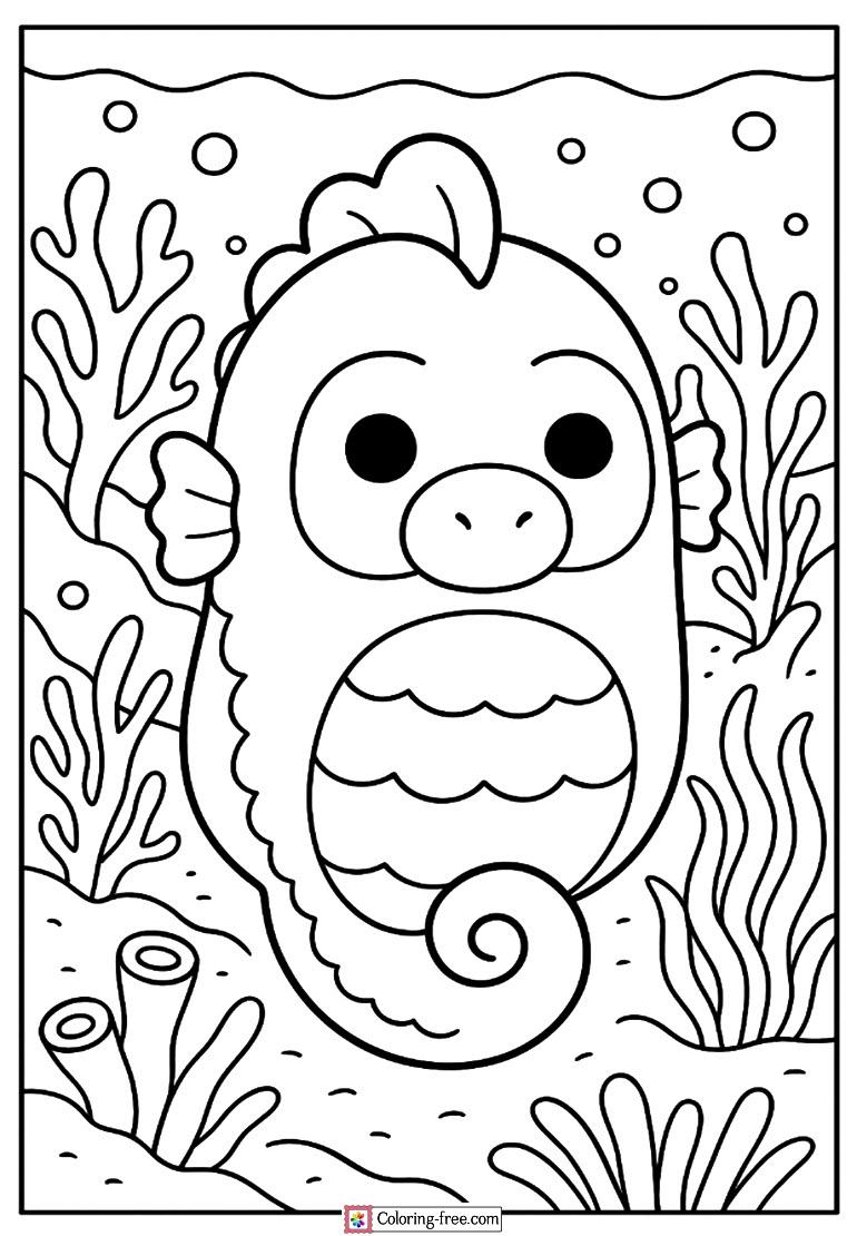 Sheldon the Seahorse Squishmallow exploring a coral garden with shells, fish and sea plants. An underwater bright coloring page.