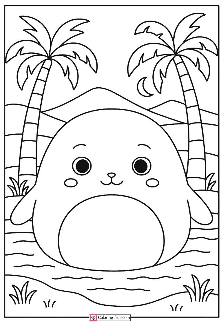 Adventurous Squishmallow resting at a desert oasis with palms, water and dunes. A very unusual, exotic coloring page with a lot of charm.