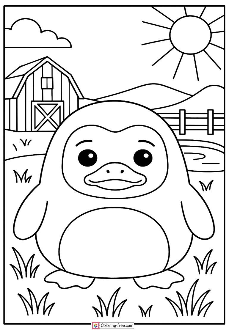 Avery the Duck Squishmallow living on the farm with barns, hay bales and critters. A bright and sunny countryside coloring page for kids and fans.
