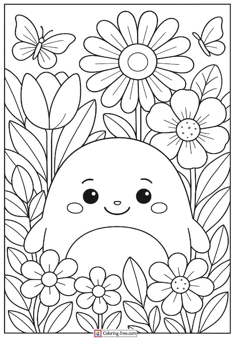 Cheerful Squishmallow seated in a flower garden of spring flowers and giant butterflies. A bright and nature inspired coloring page.