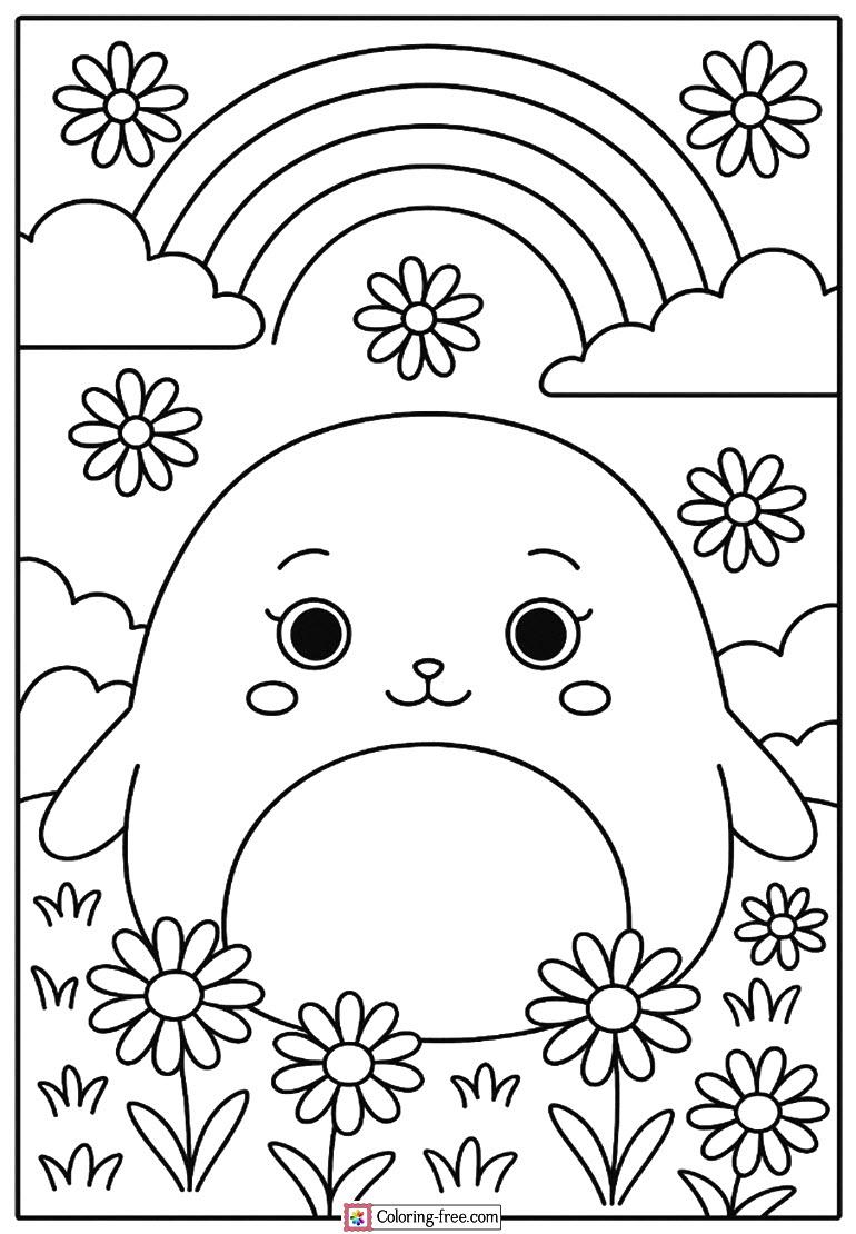 Playful Squishmallow in a magical meadow with daisies, grass and rainbows up high in the sky. A bright, joyful coloring page overflowing with joy.