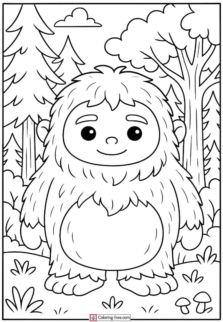 Benny the Bigfoot Squishmallow Exploring the Forest with Trees, Mushrooms and Critters A fun and adventurous coloring page of a woodland.