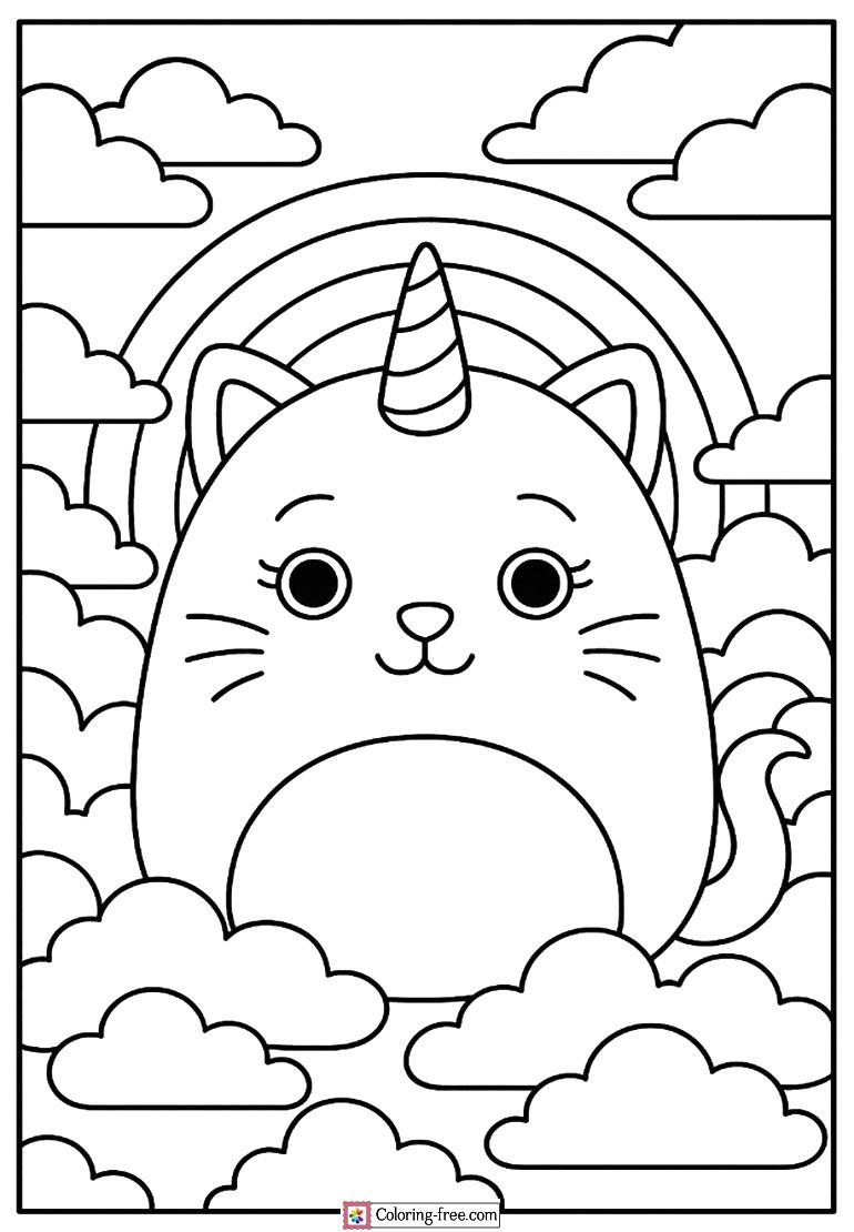 Cienna the Catcorn Squishmallow floating on rainbow clouds with sparkles stars. A magical, dreamy coloring page full of some fantasy fun.