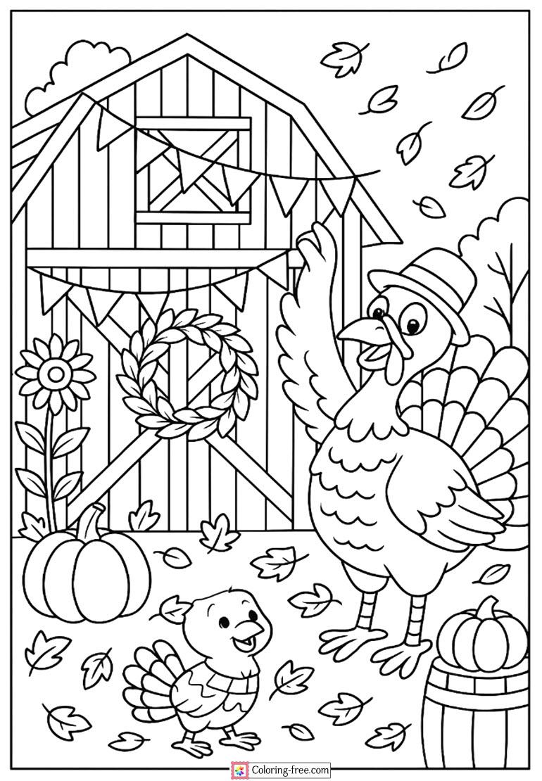 Happy coloring picture of a turkey filled with autumn leaves, pumpkins, and garlands to decorate a barn and make some happy fall celebration.