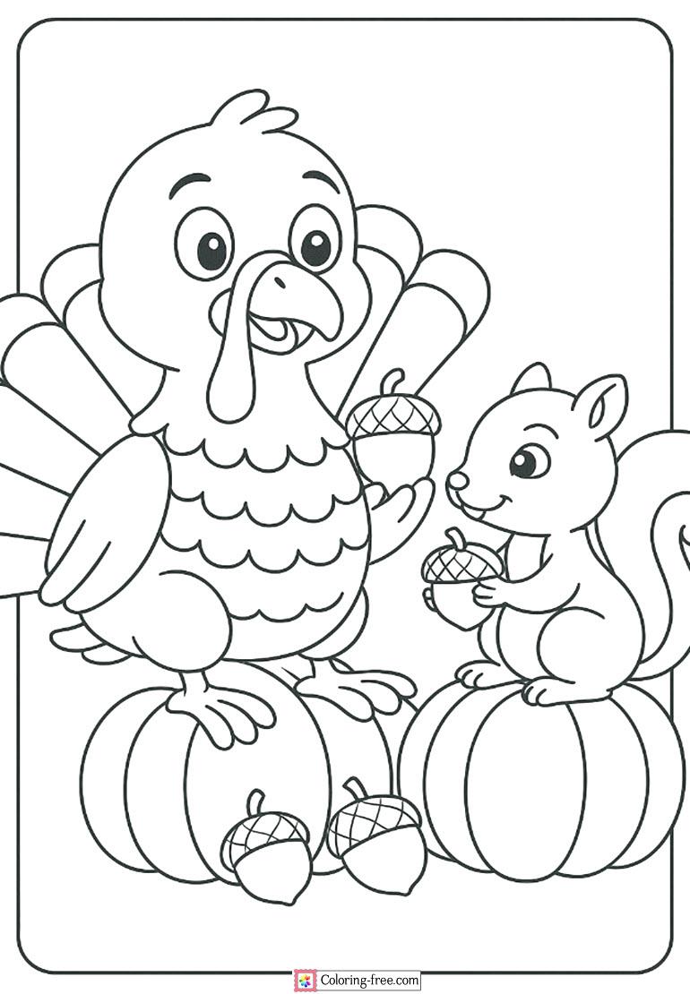 An amiable turkey and squirrel feed on acorns in a festive autumn picture. A charming Thanksgiving coloring sheet to hang in the family and kid-friendly.