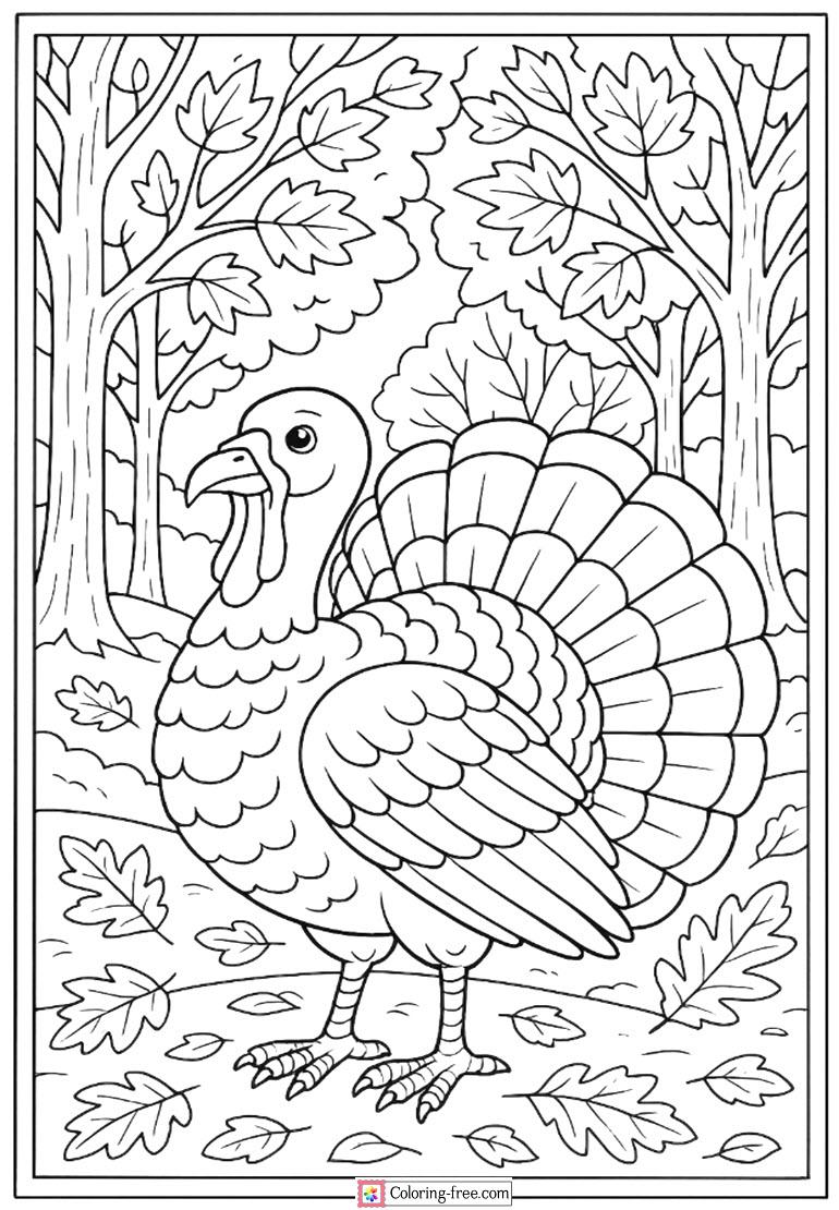 The really handsome coloring page of a proud turkey in front of colorful fall trees, which are ideal as an autumn or Thanksgiving setting.