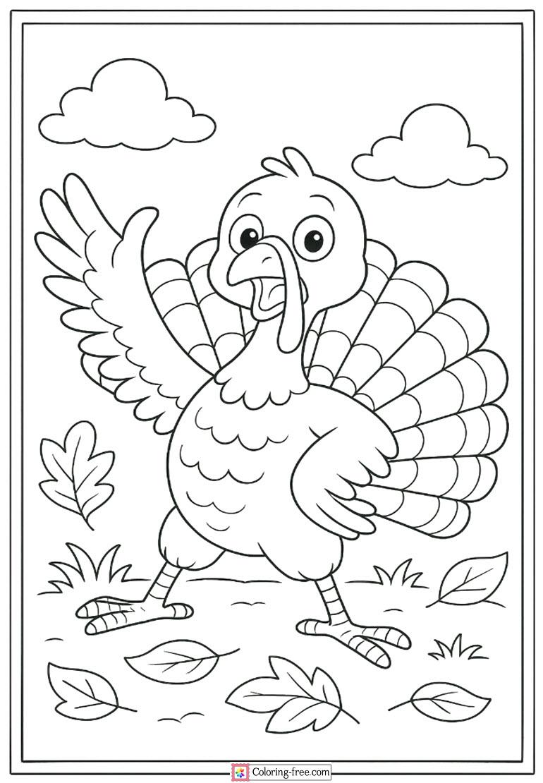 Amusing coloring page of a dumb turkey in Don t eat me pose in full personality with loads of that thanksgiving laugh.