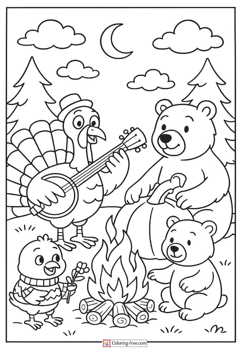 Beautiful coloring sheet of a turkey and bear sitting around campfire a play a banjo and spend a pleasant autumn evening in the woods.