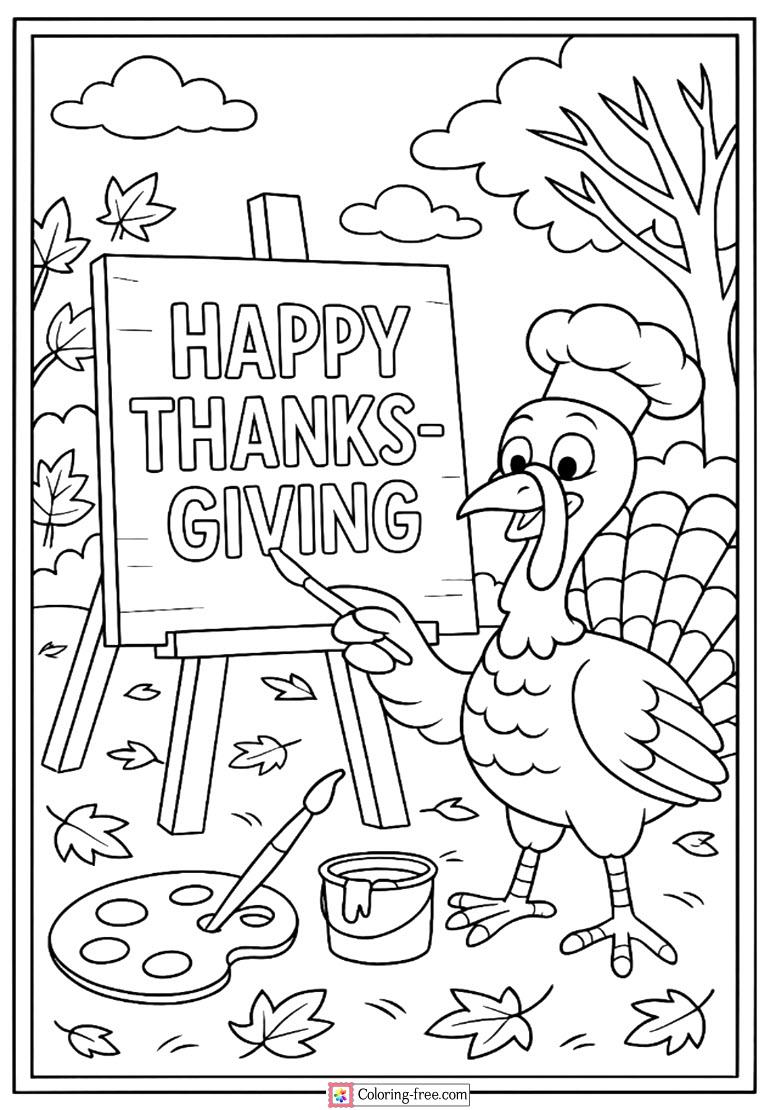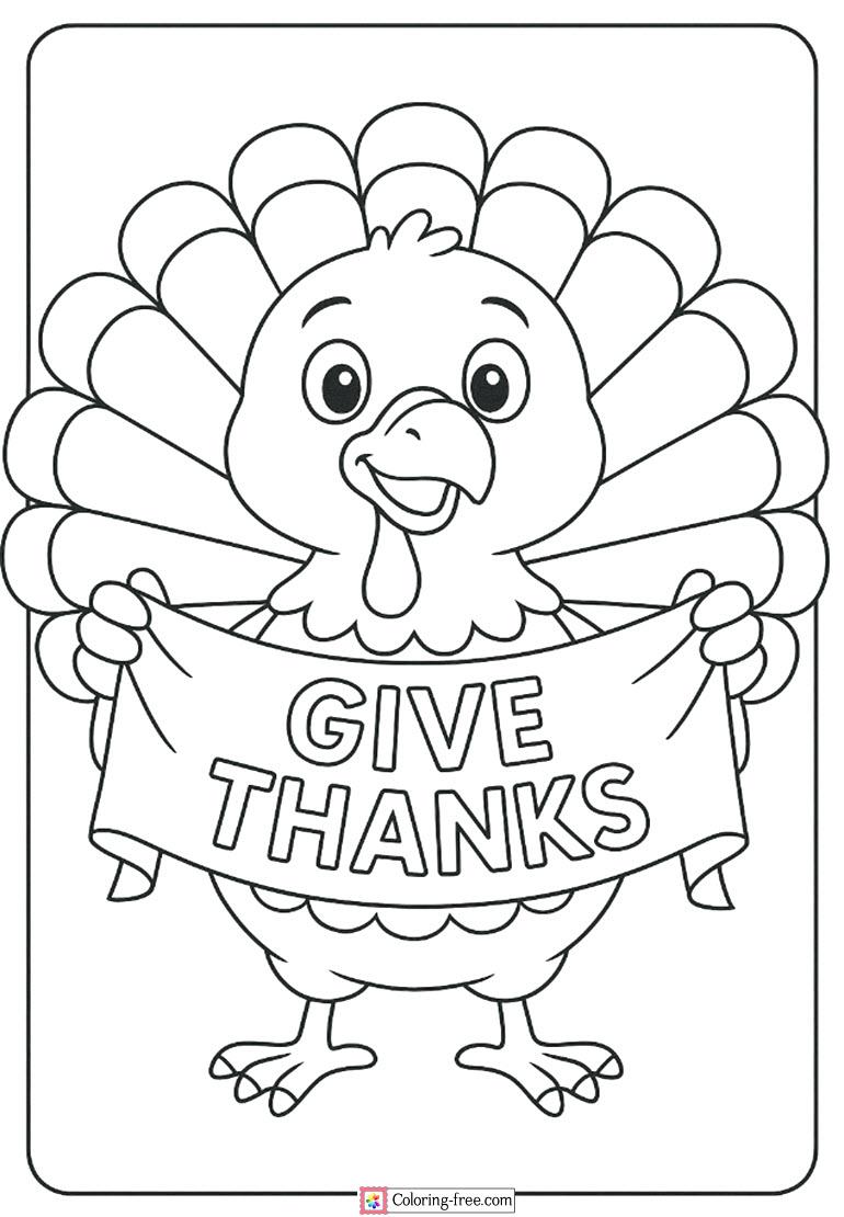 A charming turkey is ready with a banner of Give Thanks to wipes holiday bliss. A celebrating coloring page that family and children will enjoy.