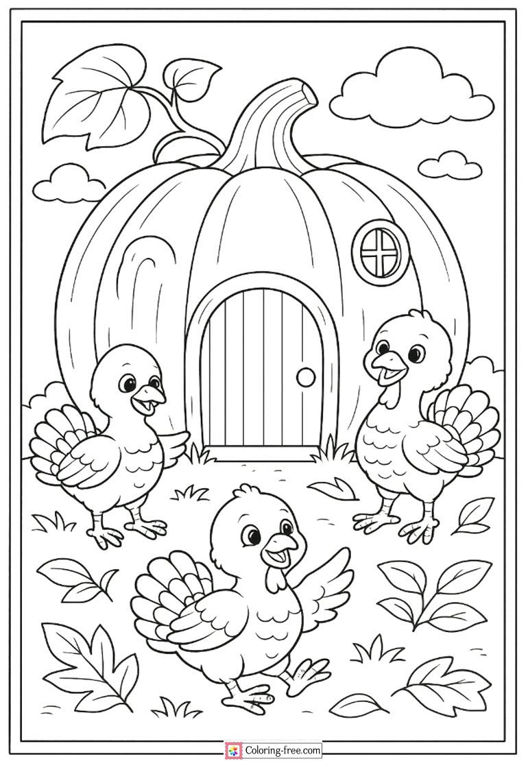 Cute printable coloring picture of little turkeys playfully chasing around the cosy pumpkin house in a sunny autumn day.