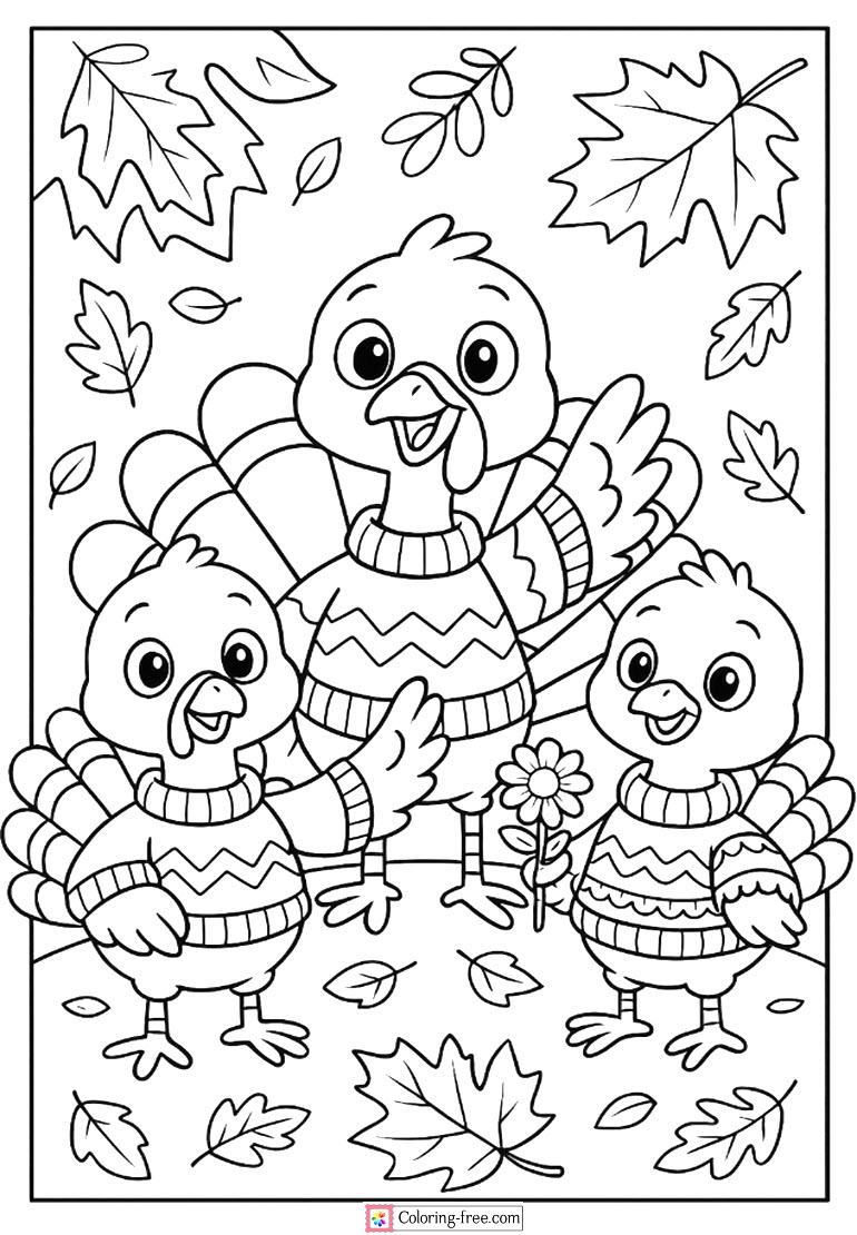 Cute and detailed adorable turkeys as Fun turkey coloring pages suitable to use as a children coloring exercise in Thanksgiving and fall coloring activities.