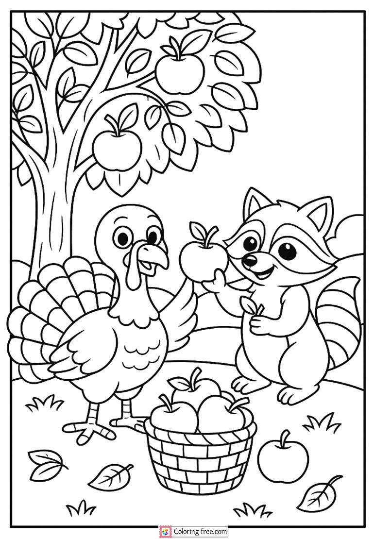 There is a friendly turkey and raccoon who pick apples in an orchard. An autumn coloring sheet fun, festive, suitable for the whole family.