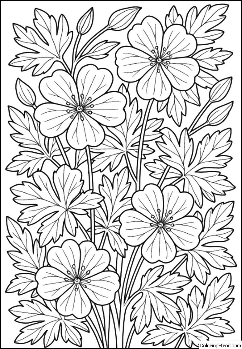 Artistic Wild Flowers Coloring Pages: My coloring page, Wild Geraniums Among Green Foliage displays fragile blooms of a forest in the presence of greenery foliage, which one would find quite peaceful and productive when creating coloring.