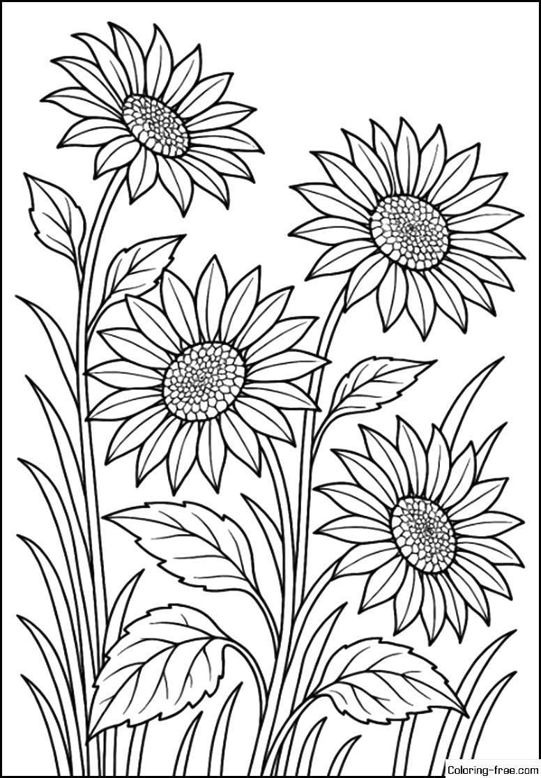 Artistic Wild Flowers Coloring Pages: Wild Sunflowers Facing the Morning Light colouring page reflects the image of shiny flowers growing at the sunrise which is ideal to relax mindful and creative colouring.