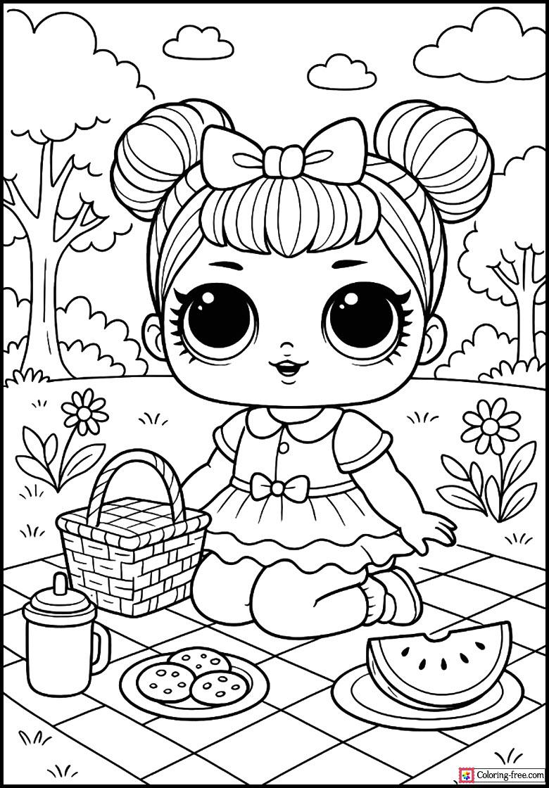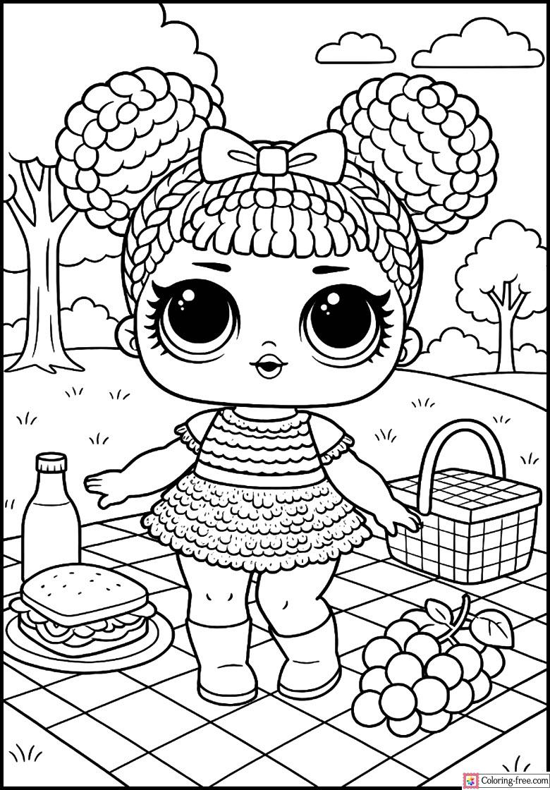 LOL Surprise Doll Coloring Pages: Cute LOL Surprise Doll having fun at the park with his picnic in the sun! Excellent detailed A4 colouring paper, which can be painted by a child and spend a time outside and have fun with a friend.